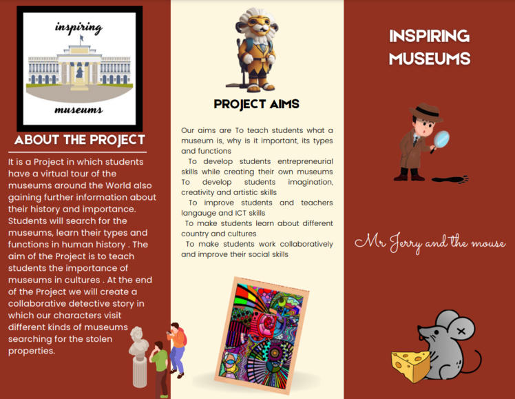 Inspiring Museums Pupils will explore museums, learning about their typesand functions in history. The aim of the project is to teach students the importance of museumsin cultures. At the end of the project, they will create a collaborative detective story in which our heroes will visit different types of museums in search of stolen objects.